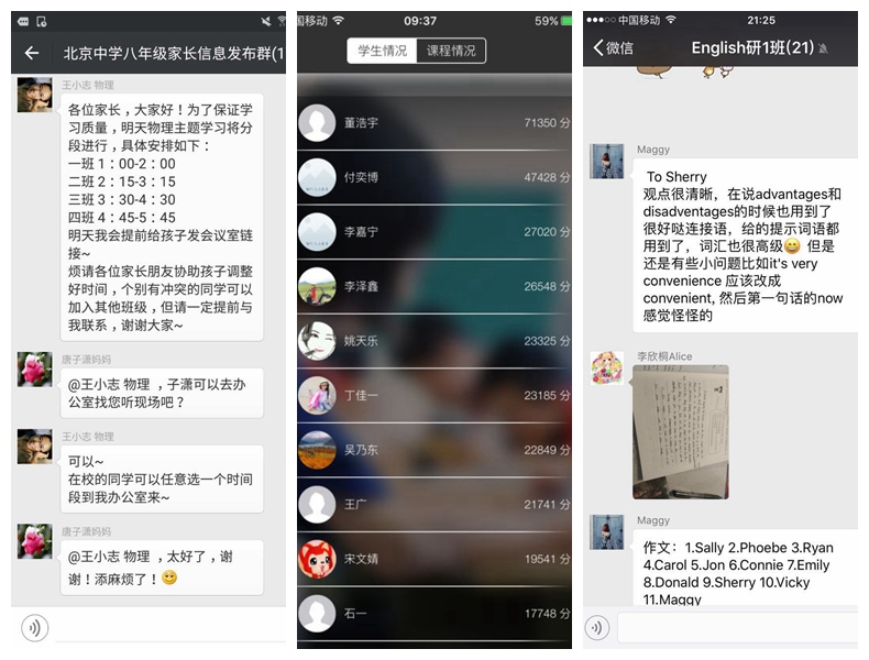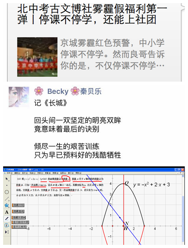 第三,混合式学习体现在每个学科。基于移动互联技术,教师们各展所长。物理课通过网络会议软件实现了直播、录播相结合的学习,数学课充分利用微课资源实现学习的个性化,地理的视频课与学习单紧密结合,英语课的每日一篇录音与微信课堂为需要的学生提供指导。早已不拘泥于教室的北中学子充分利用混合式学习方式,开展着个性化的学习。