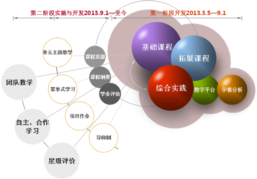 我校依据《国家中长期发展规划纲要(2010-2020年)》中对课程建设所提出的“课程结构的多样化,人才成长途径的多元化,教育资源建设丰富化”要求,基于基础性、选择性、探究性、综合性、生活化、数字化的原则,建设我校课程体系。通过整合国家课程内容、建设五大系列校本课程、变革学习方式与教学方式、变革评价方式,开发多样化的课程资源,培养具有创新精神与实践能力的中学生,为学生的未来人生奠定基础。
